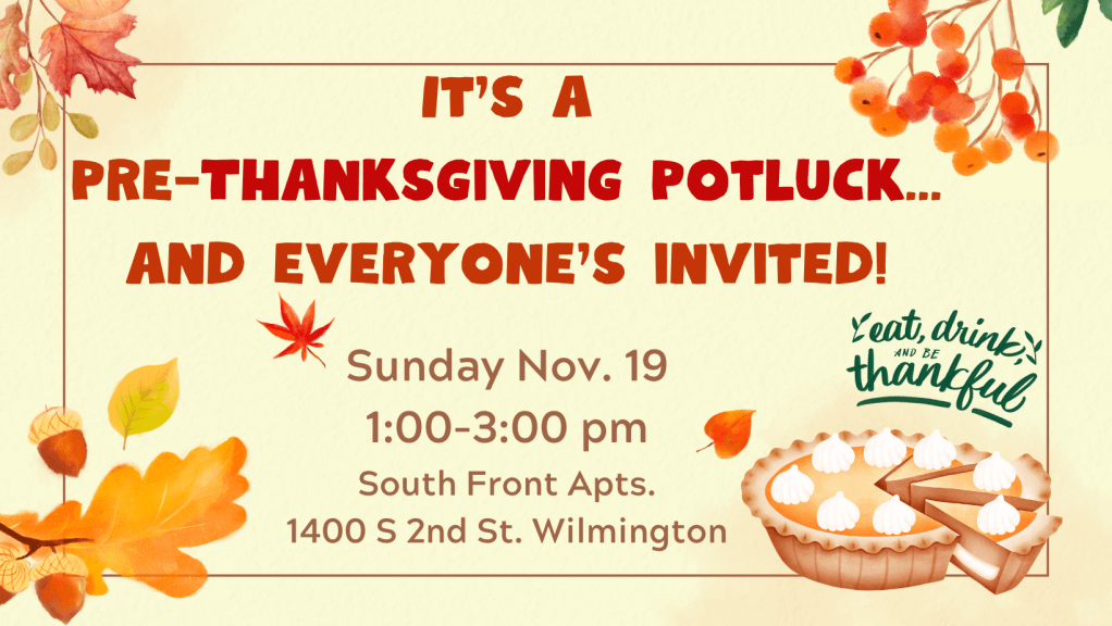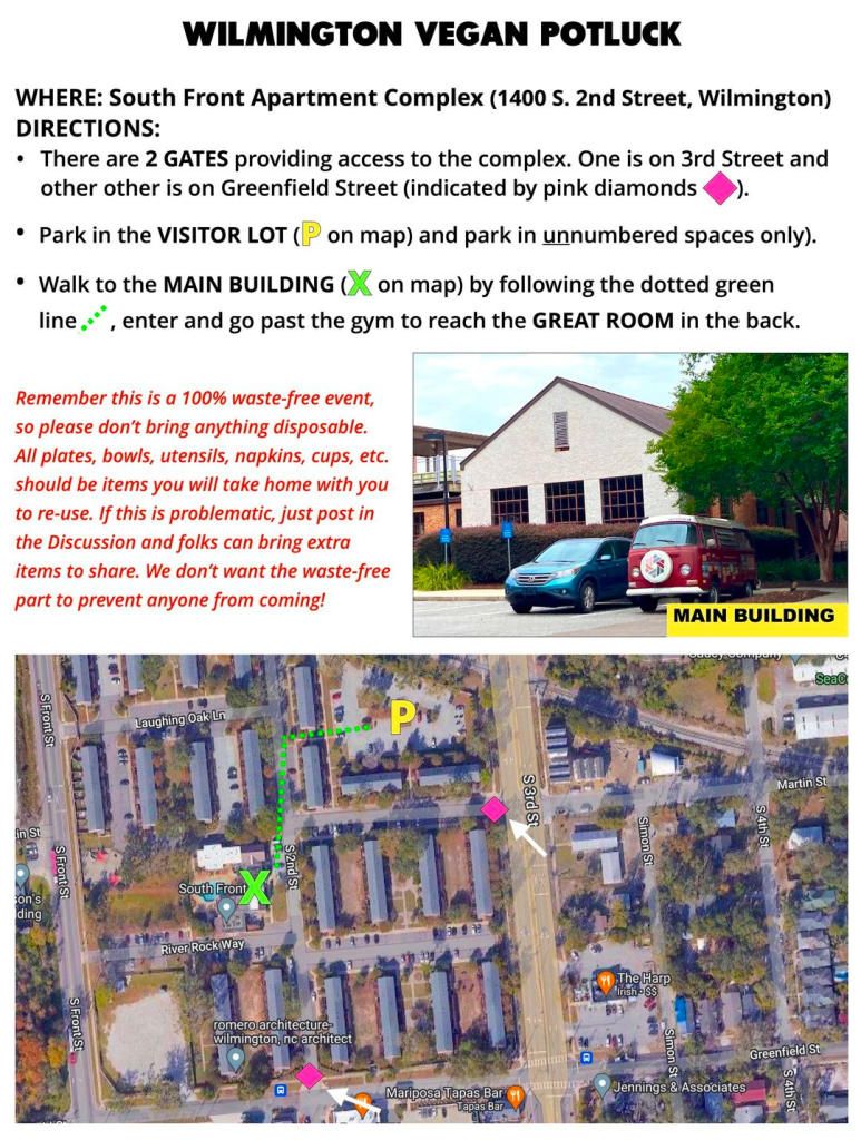 LOCATION: South Front apartment complex, 1400 South 2nd Street, Wilmington. This is a gated complex with 2 entrances: one off of Greenfield Street and the other off of S. 3rd Street. Park in unnumbered spaces only. The potluck happens in the great room of the main building. See photos below.