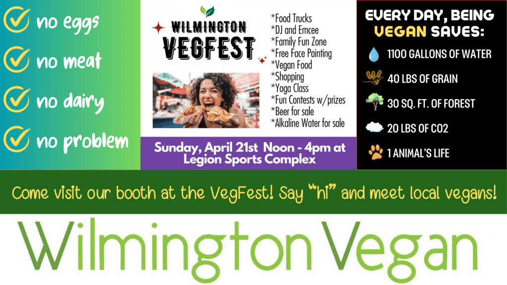 Come stop by the Wilmington Vegan booth at VegFest on Sunday, April 21, 2024 at the Legion Sports Complex, 2149 Carolina Beach Rd. from noon – 4pm.