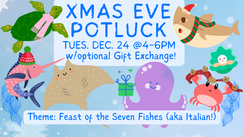 Join us for a VEGAN POTLUCK on Christmas Eve! There will also be an optional GIFT EXCHANGE (secondhand or handmade only). Details below.